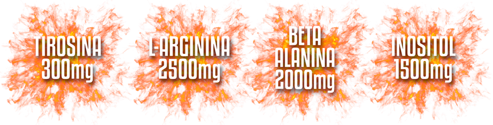 Tangerina: L-Arginina, Beta-Alanina, Inositol, Taurina, Tirosina, Vitamina C (ácido ascórbico), L-Citrulina, Vitamina B1 (tiamina), Vitamina B2 (riboflavina), Vitamina B6 (piridoxina), Vitamina B12 (cianocobalamina), acidulante: ácido cítrico, aroma artificial idêntico ao natural de Tangerina, edulcorante: sucralose, antiumectante: aerosil e fosfato tricálcico, corante amarelo crepúsculo.